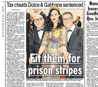 An Italian judge sentenced designers Dolce & Gabbana to prison after finding them guilty of avoiding paying $265 million in taxes. The duo was given one year and eight months behind bars and will have to pay $665,000 in fines. The New York Post says the designers are appealing the decision and will avoid jail time if they win. Italy has been especially tough on tax evaders these days as it tries to pad the governments coffers in the wake of the global financial crisis.