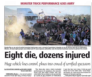 The monster truck driver who crashed into a crowd of people at a Mexican air show is being held on suspicion of manslaughter charges. 8 people were killed and dozens more were injured when the out-of-control truck slammed into the crowd. VIDEO shows the truck losing control after driving over several cars. A test revealed alcohol on the driver’s breath, though authorities haven’t said if he was drunk.