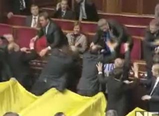 Nothing like an egg fight to show that you mean business. Ukrainian politicians showed their dissatisfaction over a measure to extend Russia’s lease for a navel port on the Black Sea yesterday by throwing eggs, smoke bombs and punches in the parliament building. The Boston Globe says the issue is one of the “emotionally charged consequences of the breakup of the Soviet Union.” VIDEO