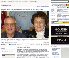 An 80-year-old Wisconsin woman is being praised for her calm under pressure after her husband had a heart attack and died in the pilot’s seat and she was forced to land the plane by herself. Helen Collins, who’d taken a handful of flying lessons two decade ago but has no license, guided the plane down with the help of her son’s voice over the radio, says the Milwaukee Journal-Sentinel.