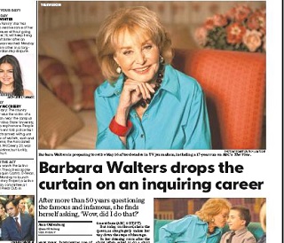 USA Today dedicates two pages to Barbara Walters and her 50+ year career on television. Reporter Ann Oldenburg says Walters can get a great interview out of anyone. She’s chatted up countless world leaders and Hollywood celebrities. She says she still can’t believe some of the things she’s been able to do in her career. Her last appearance on The View airs May 16.