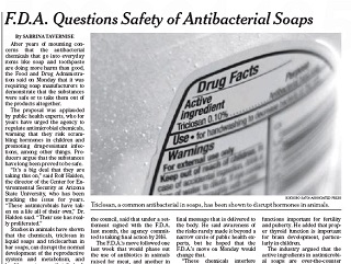 The Food and Drug Administration is requiring soap manufacturers to prove the antibacterial agents in their products are safe or take them out altogether. The New York Times says the news was welcomed by public health experts who for years have said antibacterial soaps may be doing more harm than good by disrupting hormones and by promoting drug-resistant infections. The FDA says there’s no evidence antimicrobial agents are any better at preventing infection than regular soap and water.