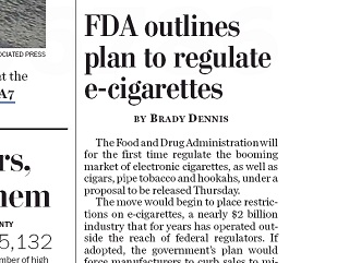 The Food and Drug Administration is outlining plans to regulate electronic cigarettes as well as cigars, pipe tobacco and hookahs. The Washington Post says the plans, if adopted, would force e-cigarette manufacturers to stop selling to minors, stop handing out free samples, put warning labels on their products and disclose the ingredients. As of yet, there are no plans to ban online sales or the use of flavorings that critics say are designed to attract young smokers.