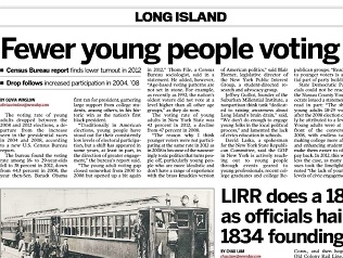 Newsday has results of a Census Bureau report that finds voting rates among 18- to 29-year-olds fell to 38 percent in 2012, down from 44.3 percent in 2008. While more young adults may have been motivated to vote in 2008 by the candidacy of Barack Obama, researchers say the toxic political climate that followed may have turned off many young voters in 2012.