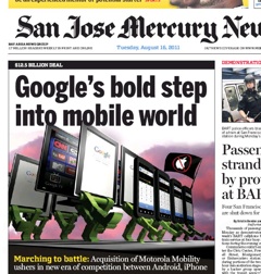 Google had its eyes trained on Apple when it announced its $12.5 billion purchase of Motorola Mobility yesterday, the largest acquisition in its 13-year history. The purchase allows Google to build up its mobile offerings and compete with Apple. But there’s a more immediate benefit to the deal says the LA Times: “ownership of more than 17,000 Motorola patents for mobile technology.” Access to the patents would allow Google to defend themselves against several lawsuits initiated by their rivals, which claim that the Android operating system violates several long-standing patents. As one analyst put it: “The reason why Google bought Motorola is, first and foremost, about the patents, they are getting hammered by everyone suing them, and they didn’t have much of a defense.”