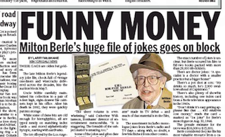 If you’re looking for some new material, start saving your money. The New York Daily News says the late Milton Berle’s legendary cabinet of jokes is going up for auction in early May. The four-foot-high cabinet is full of classic one-liners and bits from Berle’s storied career. Auctioneers aren’t sure exactly how many jokes they are—or how many of them will work—but they estimate the number is at least 20,000. Opening bid? $10,000.