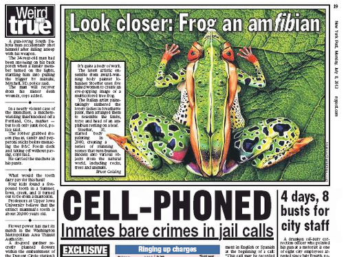 Think that’s a frog? Look again. It’s actually five women painted and arranged to look like a frog, says the New York Post. If you look closely, you can see that the limbs, legs and torso are each an intricately decorated person. Artist Johannes Stoetter is known for body painting models, which he then uses to recreate scenes from nature.