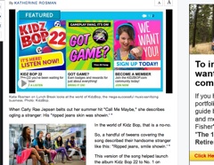 Interesting article in the Wall Street Journal this morning about the recording of Kidz Bop cover songs and the changes they make to lyrics to make songs more family friendly. Like turning this Carly Rae Jepsen description of checking out a stranger—“His ripped jeans skin was showin.’ “—into this more g-rated version: “Ripped jeans, smile showin.’ “