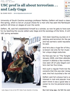 Lady Gaga has become so ubiquitous that she’s now being taught at college. The Charlotte Observer says next semester, the University of South Carolina will offer a course entitled, “Lady Gaga and the Sociology of Fame.” It’s a stretch from professor Mathieu Deflem’s usual course fodder: international policing and terrorism. Deflem has been to 29 Gaga concerts in the last year, traveling all over the world to do so. And he also runs a fan website called gagafrontrow.net . He told the paper “he didn’t think it was a good idea early in his career to mix his personal and professional lives.” Apparently, he’s gotten over that.