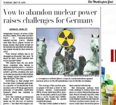 Germany has announced that it will phase out its nuclear reactors over the next decade and not build any new ones. The plan calls for the country’s 17 nuclear plants to be fully shuttered by 2022. The Washington Post says the decision is fallout from the disaster in Japan earlier this year. It will be the first industrialized nation to go nuclear free.  Germany, which receives about a quarter of its power from nuclear energy, has also promised to cut its total energy use by 10 percent.