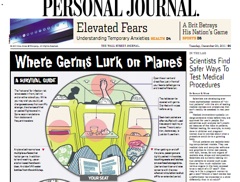 There’s some very specific “Germs on a Plane” advice in the Wall Street Journal this morning. One piece of advice: If you set the air vent to blow filtered air near your face, you can reduce the amount of shared air from the cougher next to you. Another tip: Avoid seat-back pockets, at all costs.