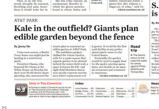 Forget the Cracker Jacks. The San Francisco Chronicle says come next season, you’ll be munching on homegrown kale at AT&T Park. The Giants announced plans for a huge 3,000-square-foot organic garden that is to be planted right behind the center-field wall, making it the first such garden at a professional sporting facility in the US. The plan is that one day the garden will supply produce for the park’s concession area and also double as an open-air classroom.