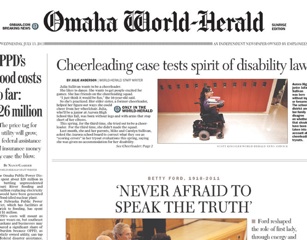 A Nebraska girl born with no arms and no legs says unfair scoring is to blame for her failed attempts to make the cheerleading squad after three years reports the Omaha World-Herald. Her parents say she was given “no accommodation for her disability” during tryouts, citing the Americans with Disabilities Act. According to the World Herald, the girl received her “lowest score in the jumps/kicks category and her highest marks in the communication skills and enthusiasm/spirit categories.”