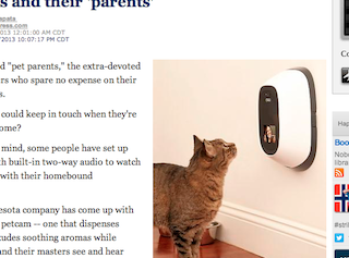 Talk about multi-tasking. The Pioneer Press says a Minneapolis-based company has come up with a new product for “pet parents,” those who can’t bare to be away from their animals for even a moment. Part food dispenser, part nanny cam, PetChatz is describes as “a greet-and-treat videophone.” Basically it allows owners to dispense treats with the click of a computer mouse as well as checking in on their four-legged friends via streaming video.