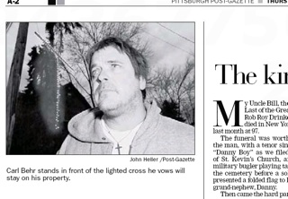 Here’s a way to get your neighbors to hate you: erect a 24-foot cross adorned with lights and shine it into their bedroom. The Pittsburgh Post-Gazette says a 45-year-old father of nine has vowed not to remove the growing collection of crosses he has recently put up in his yard despite complaints from his neighbors. He insists the angle of the lit cross has nothing to do with a complaint his neighbor lodged at him earlier in the month. Said the man: “It’s about the Lord.” The neighbor points out the towering cross went up days after he called the city to complain about the man’s property. I guess that’s just a cross the neighbor will have to bear.