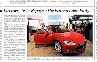 The New York Times makes a big deal of Tesla’s decision to repay its federal loan. The paper says it’s a sign that the electric car business is getting on its feet. Tesla was able to repay its loan nine years before it was due, a boon to the Obama administration, whose clean-energy initiatives took a hit when solar-panel maker Solyndra bit the dust. Note: Tesla customers will still receive a $7,500 tax credit, which drops the purchase price for a Model S to $62,400.