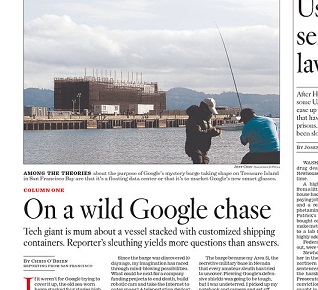 The LA Times sent a reporter up the freeway to investigate Google’s mystery barge in San Francisco. The search giant isn’t saying anything about the barge, stacked four stories high with shipping containers. One theory is that it’s a floating data center. A silicon Valley tech forecaster says it’s “like catnip for conspiracy theorists and nerds.”
