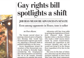 The Senate appears poised to pass the Employment Non-Discrimination Act that would ban discrimination against gay workers. Seven Republican senators are supporting the legislation. Speaker John Boehner says he won’t bring the bill up for a vote in the House. But the Washington Post says the fact that Boehner’s criticisms of the bill are more about trial lawyers than moral issues signals a softened tone from the GOP on gay rights.