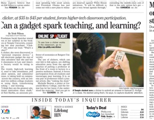 Something called the clicker is touted as the “greatest educational innovation since chalk” on the front page of today’s Philadelphia Inquirer. It’s a remote control-like device that lets students instantly participate with a lecturer and about two million college students are now using them. They are used for everything for taking attendance to fielding questions to polling student’s for their opinion. Professors say its a joy to have such an active audience, likening the clicker revolution to “waking the dead.”