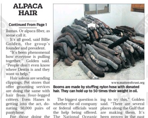 The Tampa Tribune says hair donations are flooding into Florida as residents try and protect their coastline from oil spill damage. The hair is stuffed in pantyhose to fashion homemade booms, which can absorb up to 50 times their weight (think about those days you don’t wash your hair) in oil. Alpaca hair seems to be the most prized but residents are welcoming the clippings from salons and pet groomers as well. Hanes has even stepped up and donated 50,000 pairs of pantyhose.
