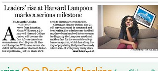 The Boston Globe says next week, 21-year-old Harvard College junior Alexis Wilkinson will become the first African-American woman to lead the 138-year-old Harvard Lampoon. Her classmate, Eleanor Parker, will serve as second-in-command and head writer. That marks the first time two women will be atop the masthead at the venerable college humor magazine.