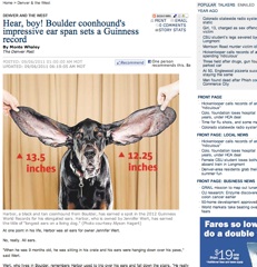 One is 13.5 inches long, the other is 12.25. The Denver Post says the ears of a Colorado dog have made the record books. Harbor, an eight-year-old coonhound, will be included in the 2012 edition of Guinness Book of World Records because of his impressive earspan. According to his owner, when he was a puppy, Harbor’s ears hung down to his paws.