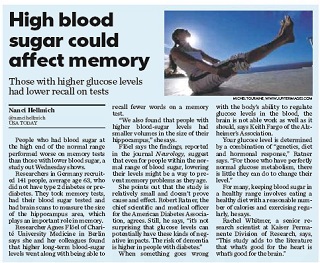 USA Today reports on a new study that found people with high blood sugar levels performed worse on memory tests than those with lower blood sugar levels. The study suggests that having lower blood sugar levels may be a key to preventing memory problems as we age. Exercising regularly and eating a healthy diet are two keys to maintaining normal blood sugar levels.