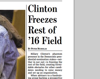 Hillary Clinton hasn’t said if she’s in or out and that, the Wall Street Journal says, has frozen the 2016 presidential race. Potential candidates should be busy raising money at this point, but the paper says no candidate has been able to build up an organization that comes close to the “shadow Clinton campaign.” Instead, some potential candidates are seen as trying to “plant flags” in case Clinton chooses not to run.