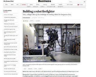 Engineers all over the world are working on building robots that can be sent in to dangerous situations - such as fighting fires or shutting down damaged nuclear plants. The Boston Globe describes just how difficult it is to fine tune a robot for these types of tasks. This summer, the Navy plans to test a firefighting robot on one of its ships.