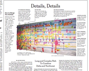 Imagine if your to-do list looked like this. According to the New York Times, this is the board at Delta Airlines HQ showing the steps necessary for merging an airline. Part of a merger’s complexity, says an airline executive, is that it can end up looking a lot like Noah’s ark, with two of everything. Another problem is melding of two different cultures: “Delta always thought of itself as the gracious host. Hence its flight attendants poured the requested drinks. Northwest was the practical carrier; its attendants just handed over the can.” Then there are the thousands of little details—integrating customer loyalty programs, new airport locations, unifying computer platforms—that could really make someone’s head spin. (Click image above for a closer look at Delta’s Post-It note plan)