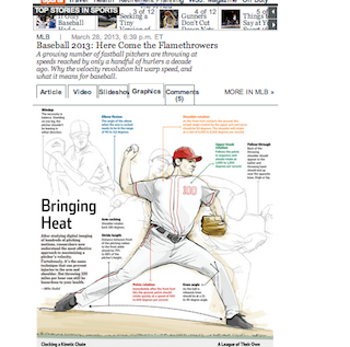 Baseball fans will appreciate the interesting graphics in the Wall Street Journal this morning. They accompany a feature story about how many really fast pitchers there are in baseball this year. The Journal says after studying hundreds of photos researchers understand how to maximize a pitcher’s velocity. Turns out it’s a pretty complex operation to throw a 100 mph pitch, which is dependent on things like stride length (distance should be 79-89 percent of the pitcher’s height) and elbow flexion (in cocked position should be between 90 and 112 degrees.)