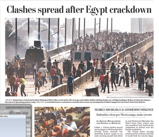 Security forces in Egypt stormed the camps of supporters of ousted president Mohammed Morsi. The early morning assaults killed at least 300 people. A reporter from the Washington Post recounts her experiences after being caught in the raid on the opposition forces’ main encampment. Abigail Hauslohner says the attack was stunning in its ferocity. She says one officer told her and her colleagues, “If I see you again, I’ll shoot you in the leg.”