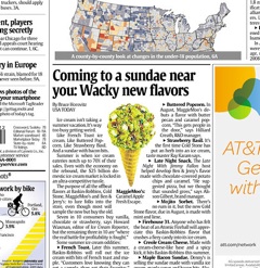 This is not the summer of cookies’n'cream. Or Rocky Road. It’s the summer, says USA Today, of weird ice cream flavors. Despite the fact that seven out of ten customers buy vanilla, strawberry or chocolate when selecting a scoop, ice cream parlors are trying to lure in new business by offering up oddities. Maple Bacon Sundae, anyone? Creole Cream Cheese? You can get the former at Denny’s, the latter at Baskin-Robbins. Ben and Jerry’s enlisted Jimmy Kimmel to come up with their latest offering, Late Night Snack, which features chocolate-covered potato chips and caramel. And over at Cold Stone, they’ve decided to add an herb to one of their best sellers, for the first time ever. Curious? Order the Strawberry Basil.