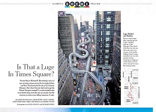 While New York City tried and failed to land the 2012 Summer Games, the New York Times imagines what it would be like if the city hosted the Winter Games by superimposing various Olympic venues over different parts of Manhattan. The downhill ski slope, for example, would start at twice the height of the Empire State Building, covering two miles of Central Park.