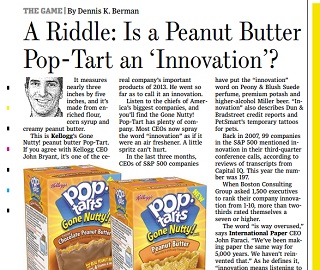 The iPhone. The Boeing 747. The Peanut Butter Pop-Tart. One of these might not exactly meet the definition of an innovation. Yet, the Wall Street Journal’s Dennis Berman says that’s exactly how Kellogg’s CEO John Bryant described the company’s latest Pop-Tart offering. Berman says the term “innovation” is widely overused. Analysts listened to the conference calls of the top 500 US companies—and found 197 of them bragged about innovation