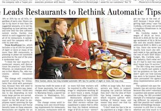 Tips are on the menu again this morning. Yesterday it was the Pete Wells column in the Times saying tips don’t do much to improve service. Today the Wall Street Journal says the IRS is about to start forcing restaurants to report automatic service charges not as tips, but as regular income. Waiters, as you might imagine, don’t like that. The change, which is set to go into effect in January, isn’t popular with restaurants either because it’s likely to make payroll accounting much trickier.