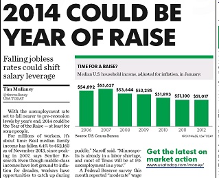 USA Today says falling unemployment rates are shifting some leverage to the worker, making it possible that 2014 will be a good year to get a raise. The best candidates are those in cities with full employment and those who are willing to change jobs. One economist says the pool of workers that companies have been using to keep wages down will turn into a puddle.