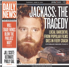 There’s a sad case of life imitating art on the front page of the Philadelphia Daily News this morning. “Jackass” star Ryan Dunn died last night, in a fiery one-car crash, allegedly after a night of drinking. He was 34. Police say Dunn’s 2007 Porsche 911 GT3 was already engulfed in flames when they arrived on the scene but they suspect he veered off the highway,“barreled over a guardrail and into a wooded area.” Alcohol is also suspected in the accident. Apparently, Dunn posted a photo on his Twitter account just hours before his death, with a beer in hand. Police were able to identify the reality star by his “facial hair and tattoos.”