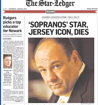 Actor James Gandolfini suffered a heart attack while in Italy yesterday and died at the age of 51. The Newark Star-Ledger says the news hit fans “as abruptly — as shockingly, as this-can’t-be-happening — as those famous, final few minutes of ‘The Sopranos.’” Gandolfini is described as a “homegrown Jersey guy” but not a wiseguy—he was actually a “shy man with a gentle voice.” who developed Tony Soprano’s fuhgeddaboutit voice with help from a dialect coach.