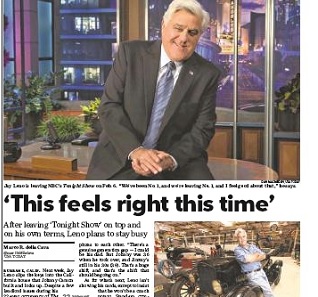 Jay Leno gives an exit interview with USA Today as he prepares to leave the Tonight Show after 22 years. He says one of the tricks to remaining sane in the television business is having a normal live off-camera. Leno says he won’t be sentimental about his place in TV history, saying his interns couldn’t tell you who starred in Gunsmoke, and that was on for 20 years too.