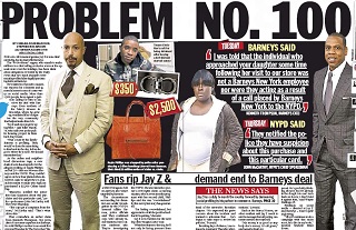 The New York Daily News says Jay Z has problem #100 as his fans are calling on the rap superstar to end his association with Barneys. Jay Z is in line to make millions of dollars in a deal selling exclusive items at Barneys over the holidays. So far he has remained silent amid allegations that two black shoppers were racially profiled after buying items at Barneys.