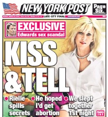 My interest in this story is zero. Yet, apparently there’s an appetite for an update on the mistress of John Edwards. She gave her first exclusive interview to GQ and this morning, the New York Post has a sneak peek. Rielle Hunter details how the two met and tries to paint Elizabeth Edwards, who was battling breast cancer during their affair, as the bad guy. Hunter calls the ex-Senator’s wife “routinely abusive” and says “most of [Edwards’] mistakes or errors in judgment were because of his fear of the wrath of Elizabeth.” Really?