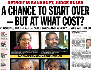 A federal bankruptcy judge has declared Detroit eligible for bankruptcy protection. The Detroit Free-Press says that sets the stage for a fierce fight over how to reduce debt and retiree benefits. The judge ruled that public pensions are not protected from cuts; a landmark decision that could affect financially troubled cities across the country.