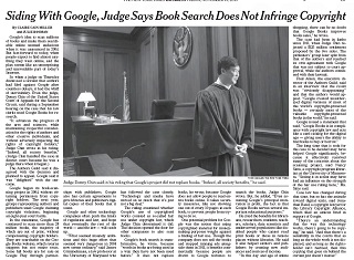 A judge in New York has dismissed a lawsuit filed 8 years ago by the Authors Guild over Google’s idea to scan millions of books and make them searchable online. The New York Times says Judge Denny Chin admitted that his law clerks used Google Books in researching the case. He said the search function doesn’t replace books, and that all society benefits from the project.