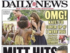 Well isn’t that ironic? There’s a priceless photo of the Duchess of Cambridge on the front page of the New York Daily News this morning. As the royals continue to make a fuss over the long-lens topless photos of Kate, here she is visiting with topless tribal women in the Solomon Islands. Is it me, or does it seem like the irony of this visit is not lost on the princess.