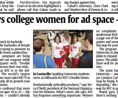 First they got rid of the buns, now they’ve discovered they need them. In a bid to promote their bun-less sandwich, USA Today says KFC is hiring college women to don fitted sweatpants with phrase “Double Down” written across their, what else, buns. You’ll remember that the Double Down is the latest affront to healthy eating, employing two pieces of fried chicken to stand in for the bun and adding bacon, cheese and something called the “Colonel’s sauce.”