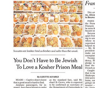 The New York Times says there’s a battle brewing in Florida over kosher meals in prisons. Prisoners, much like airline passengers, have discovered that kosher meals are often more tasty than the standard fare. But they’re also four times as expensive. Florida officials are trying to eliminate kosher meals, but a legal battle has hampered their efforts so far.