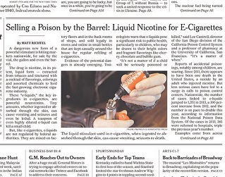 Just a tiny amount of liquid nicotine can cause vomiting or seizures - and even a diluted amount can kill a small child. Yet, liquid nicotine is being sold legally, with no regulations, as the main ingredient in refillable “e-cigarettes.” The New York Times says reports of accidental poisonings are soaring. One poison control center director says many people seem unaware of the dangers posed by the liquids.