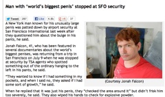 “Sir, do you have something in your pants?” I know, I know,—it sounds more like the start to a bad pick-up line than a news item, but the San Francisco Chronicle says that’s what Jonah Falcon was asked by TSA agents at SFO last weekend. Falcon, who’s known for having the “world’s biggest penis,” says his encounter went like this: “They wanted to know if I had something in my pockets, and when I said no, they asked if I had some sort of growth.”