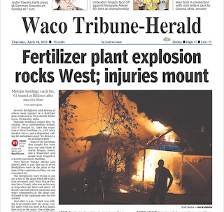 A massive explosion at a Texas fertilizer plant has left anywhere from five to 15 people dead, and more than 160 injured reports the Waco Tribune Herald this morning. The explosion, which took place just after 8:00 p.m. last night set several houses and buildings on fire, including a nearby nursing home and caused the mass evacuation of the town of West. Authorities say there is no reason to believe the explosion was anything other than an accident but are investigating the scene nonetheless. WATCH THE EXPLOSION